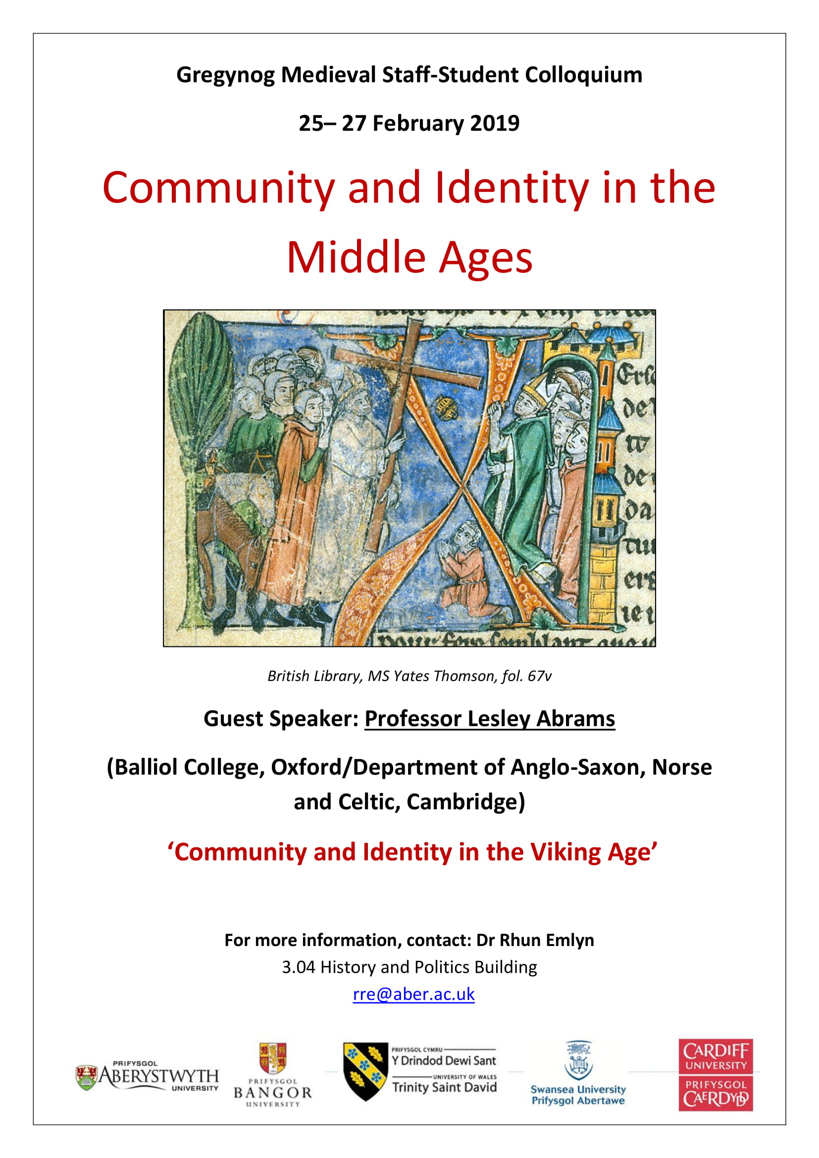 November 28, 2018 Gregynog Medieval Staff-Student Colloquium, 25-27 February 2019: ‘Community and Identity in the Middle Ages’ About the author Kiri Kolt Author archive About the post Uncategorized Post navigation Coming soon in Summer 2019….Call for Papers: ‘Where did you come from, where did you go? Origin Narratives and the History of Peoples, Places and Ideas’, 27-29 June 2018