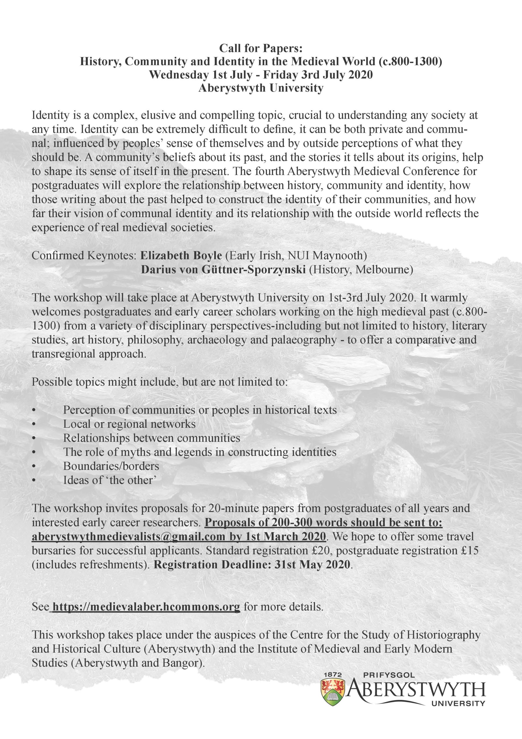 January 22, 2020 Call for Papers: History, Community and Identity in the Medieval World (c.800-1300) 1st-3rd July 2020 Aberystwyth University More information about the conference in general and registration can be found here. About the author Kiri Kolt Author archive About the post 2020 Conference Post navigation Another year, another great #MedievalAber conferenceThird Speaker for #MedievalAber Conference