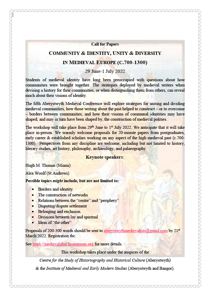 February 25, 2022 Call for Papers: COMMUNITY & IDENTITY, UNITY & DIVERSITY IN MEDIEVAL EUROPE (C.700-1300), 29 June-1 July 2022 About the author Kiri Kolt Author archive About the post 2022 Conference Post navigation Registration now open for the 2021 Aberystwyth Medieval Conference!Registration for the 2022 Conference Now Open!